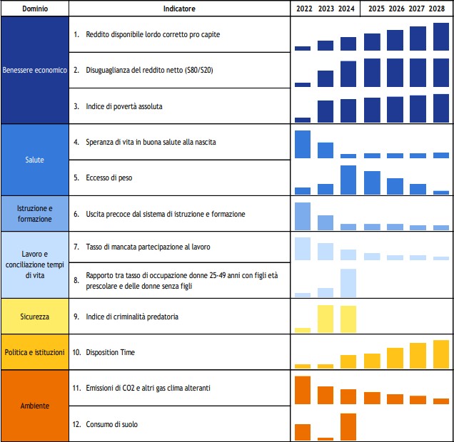 In particolare, il documento basandosi sui dati messi a disposizione dall'ISTAT entro il 30 settembre 2025, analizza a consuntivo l'andamento degli indicatori BES al 2024 (per alcuni indicatori, come specificamente riportato nella relativa descrizione a seguire, il dato definitivo disponibile è riferito al 2023 o al 2022) fornendo previsioni estese al 2028 per 9 di questi.