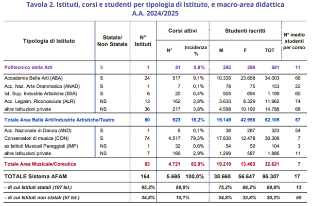 In primo luogo, il Focus riporta che il 51% delle Istituzioni concerne l'Area musicale e coreutica, mentre il restante 49% afferisce all'Area delle belle arti, industrie artistiche e teatro. Mentre nel settore musicale e coreutico gli istituti pubblici sono la larghissima maggioranza (il 90%) in quello delle belle arti, delle industrie artistiche e del teatro il settore privato registra una certa prevalenza (il 61%).