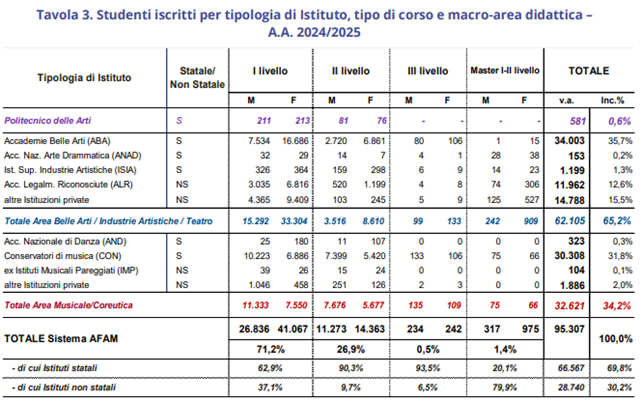 Venendo al numero di studenti iscritti, nel 2024/2025 essi sono stati 95.307, di cui il 69,8% iscritti a istituzioni pubbliche. Il 65,2% del totale è iscritto a istituti operanti nel settore delle belle arti, delle industrie artistiche e del teatro, mentre il 34,2% a istituti operanti nel settore musicale e coreutico. Il restante 0,6% di studenti afferisce al Politecnico delle Arti che, nascendo dalla fusione per incorporazione di un'accademia di belle arti e di un istituto superiore di studi musicali, comprende sia l'area Artistica che l'area Musicale.