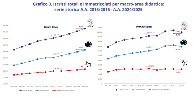Rispetto all'anno accademico precedente l'A.A. 2024/2025 registra tuttavia, per la prima volta dal 2015/2016, un calo complessivo delle immatricolazioni del 3,4%, più consistente nell'area artistica che nell'area musicale.