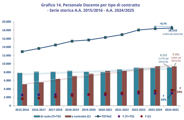 Il numero di docenti, nel corso dell'ultimo decennio, è aumentato del 44% del totale, ma questo è dovuto quasi esclusivamente dalla crescita della componente dei contrattisti (aumentati dell'84%, mentre gli strutturati sono cresciuti solo del 17%).