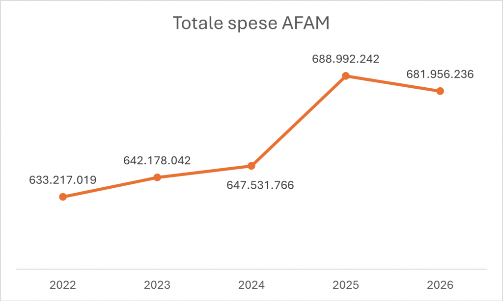 Il grafico sottostante mostra l'evoluzione diacronica della dotazione dei programmi riguardanti la spesa per le istituzioni AFAM negli ultimi anni. Si tenga presente che per il 2025 e per il 2026 i dati sono ancora di natura previsionale, non essendo ancora disponibili i rendiconti, mentre per il triennio precedente sono dati di consuntivo