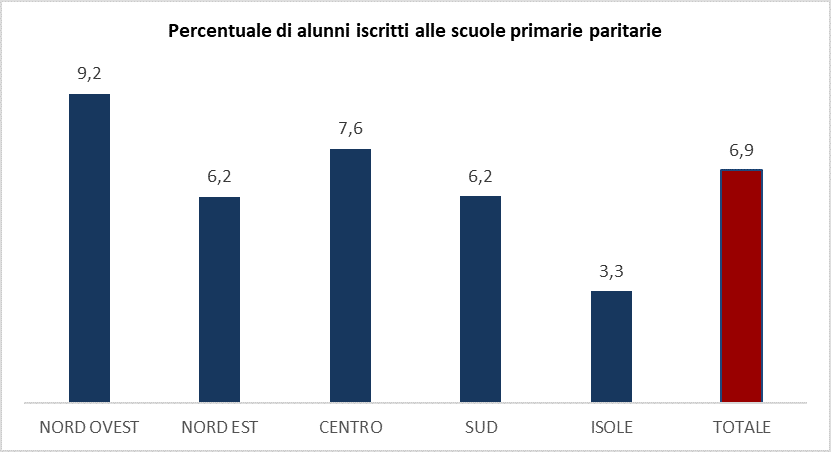 Il grafico che segue mostra la percentuale di alunni iscritti alle scuole primarie paritarie, suddivisa per area geografica. Si osserva una notevole differenza territoriale nelle iscrizioni alle scuole paritarie. A fronte di una media nazionale pari al 6,9%, si registra infatti un valore significativamente più alto nel Nord-Ovest, dove gli iscritti rappresentano il 9,2% del totale degli alunni della scuola primaria. Seguono il Centro con il 7,6% e, a pari merito, il Nord-Est e il Sud con il 6,2%. Di gran lunga più bassa, anche rispetto alla media nazionale, risulta invece la percentuale nelle Isole, dove soltanto il 3,3% degli alunni frequenta una scuola primaria paritaria.