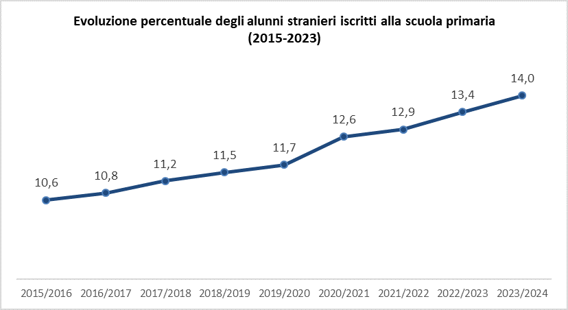 Questa tendenza riflette un processo di crescente pluralismo culturale all'interno del sistema scolastico italiano, segnalando un progressivo radicamento delle famiglie straniere nel Paese e una loro crescente partecipazione all'istruzione pubblica. L'aumento regolare della percentuale suggerisce inoltre che l'integrazione scolastica sta avvenendo fin dalle prime fasi del percorso educativo, con un impatto strutturale sulla composizione delle classi nella scuola primaria. Si tratta di un fenomeno che, oltre a implicare esigenze specifiche in termini di politiche educative e risorse didattiche, evidenzia il ruolo centrale della scuola primaria come primo luogo di incontro e inclusione per i bambini di origine straniera nel contesto italiano.