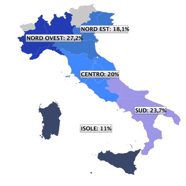 La figura che segue rappresenta la distribuzione percentuale degli alunni iscritti alla scuola secondaria di primo grado sul totale nazionale, suddivisa per area geografica. Dalla figura emerge che la quota più elevata di alunni si concentra nel Nord-Ovest, che rappresenta il 27,2% del totale nazionale. Segue il Sud con il 23,7%, un dato che sottolinea la consistenza demografica dell'area meridionale, nonostante la progressiva denatalità che ha colpito negli ultimi anni l'intero Paese. Il Centro contribuisce con il 20%, mentre il Nord-Est si attesta al 18,1%. La percentuale più bassa si registra nelle Isole, che raccolgono l'11% degli alunni iscritti. Questa distribuzione conferma il peso demografico ancora significativo delle regioni meridionali e del Nord-Ovest nel panorama scolastico nazionale.