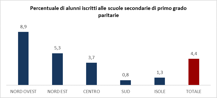 Il grafico che segue rappresenta la percentuale di alunni iscritti alle scuole secondarie di primo grado paritarie, suddivisa per area geografica. I dati mostrano un forte squilibrio territoriale. Nel Nord-Ovest la quota di iscritti raggiunge l'8,9%, quasi il doppio rispetto alla media nazionale, che si attesta al 4,4%. Nel Nord-Est la percentuale scende al 5,3%, mentre nel Centro si ferma al 3,7%. La situazione cambia radicalmente nel Mezzogiorno: al Sud solo lo 0,8% degli studenti frequenta una scuola secondaria di primo grado paritaria, e nelle Isole la percentuale è dell'1,3%.
