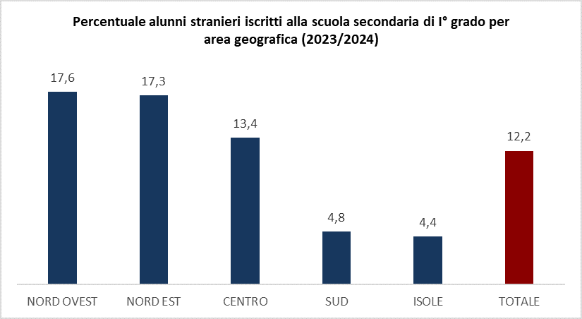 Ciò riflette la realtà demografica e sociale di un Paese in cui i flussi migratori si sono storicamente radicati prima e in misura maggiore al Nord, attratti dalla maggiore offerta lavorativa, dalle reti familiari e da una maggiore disponibilità di servizi. Al contrario, il Sud e le Isole continuano a registrare una presenza molto più limitata, suggerendo un divario significativo nei processi di integrazione scolastica, nelle esperienze interculturali quotidiane e nella composizione delle classi. L'asimmetria territoriale rilevata suggerisce una riflessione sulle politiche scolastiche, tenendo conto delle specifiche esigenze educative e culturali delle aree più coinvolte dal fenomeno migratorio.