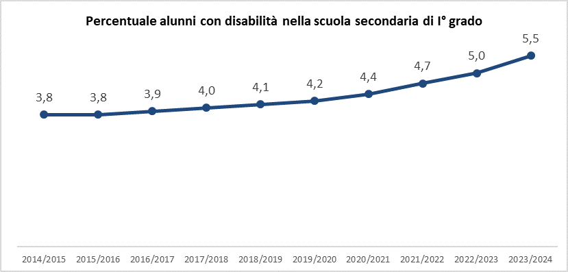 Per quanto riguarda la scuola secondaria di primo grado, nel periodo compreso tra l'anno scolastico 2014/2015 e il 2023/2024 emerge una crescita graduale e costante: si parte da un valore del 3,8% che rimane stabile nei primi due anni, per poi salire progressivamente fino a raggiungere il 5,5% nell'anno più recente. L'aumento risulta particolarmente marcato a partire dal 2020/2021, suggerendo un'accelerazione nella crescita della presenza di studenti con disabilità in questo ordine di scuola. L'andamento riflette una tendenza strutturale che potrebbe essere attribuita sia a una maggiore capacità di individuazione e certificazione delle disabilità, sia a una crescente attenzione verso l'inclusione scolastica. Questo andamento segnala un'evoluzione significativa della composizione della popolazione scolastica e pone una crescente esigenza di risorse educative, professionali e organizzative dedicate all'inclusione delle persone con disabilità.